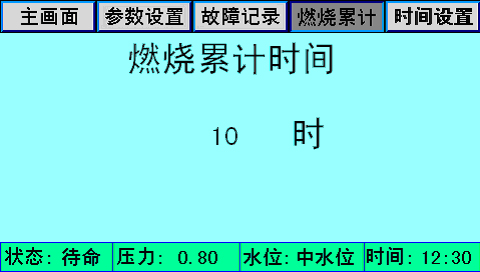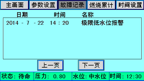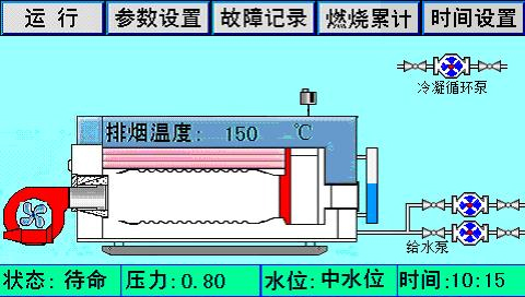 主畫面上同時顯示控制器狀態(tài)、系統(tǒng)壓力、水位、時間、燃燒器狀態(tài)、泵狀態(tài)等。