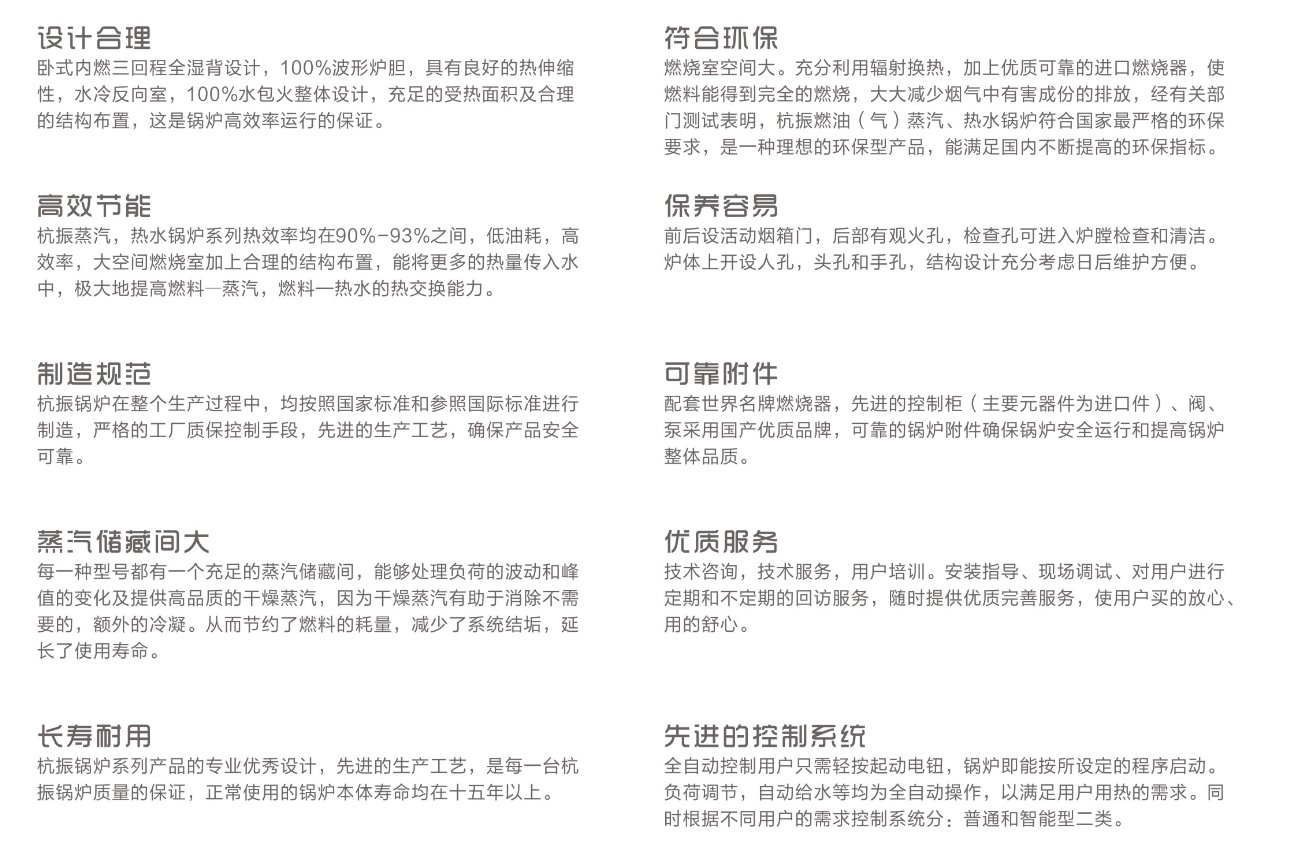 采用較成熟的三回程全濕背結(jié)構(gòu),安全可靠。爐膽采用波形爐膽,既強(qiáng)化了煙氣的擾動(dòng),又增大了輻射傳熱面積;既增加了爐膽的剛度,又有效的減弱了爐膽的熱應(yīng)力;既增強(qiáng)傳熱效果,又促進(jìn)為燃料在爐膛內(nèi)的燃燒;整個(gè)受熱面呈對(duì)稱布置,結(jié)構(gòu)強(qiáng)度牢靠,水循環(huán)系統(tǒng)合理。上鍋筒水容量大,蒸汽空間大,蒸汽品質(zhì)好,運(yùn)行期水位波動(dòng)小。